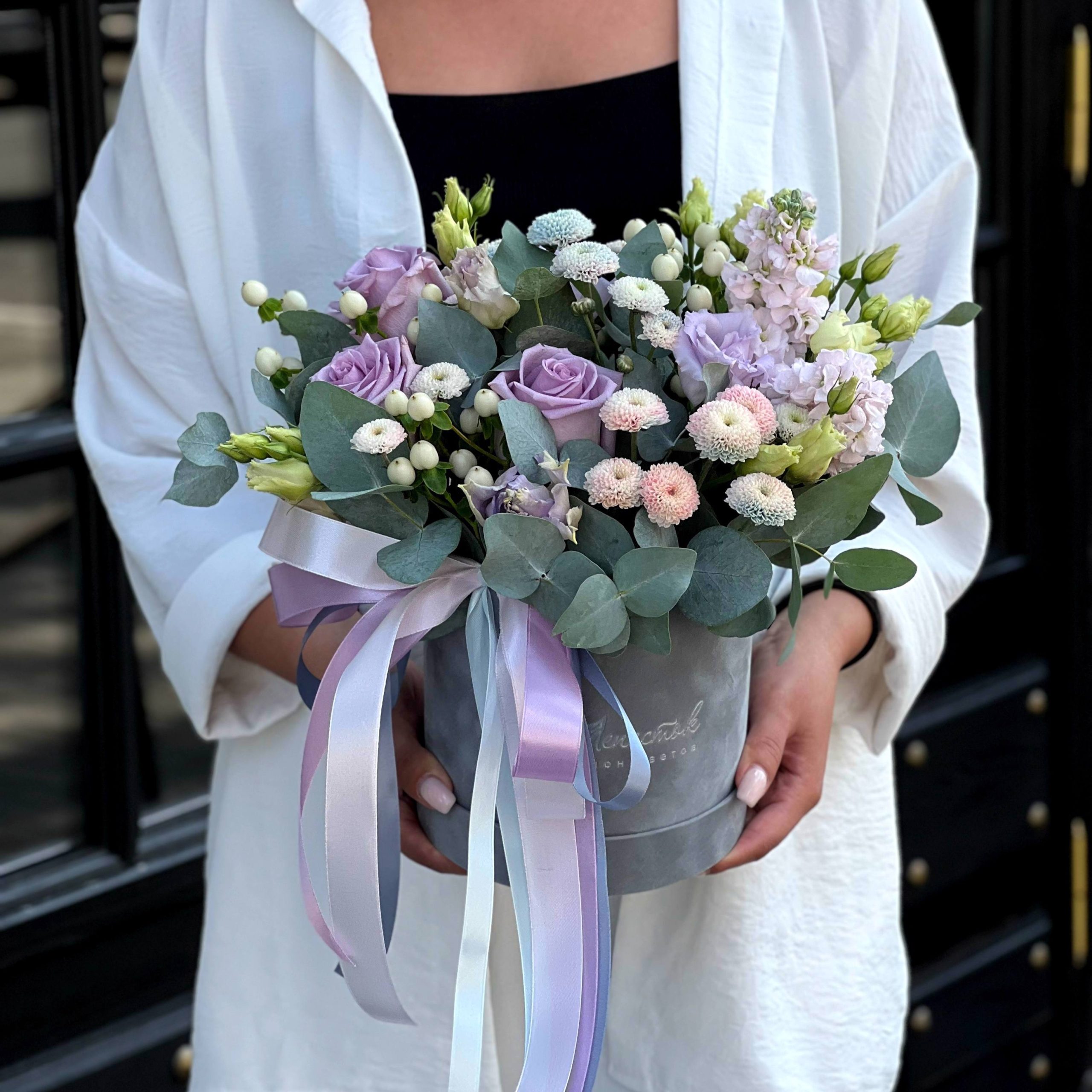 Бархатный цилиндр из лавандовых маттиол и роз в Реже
